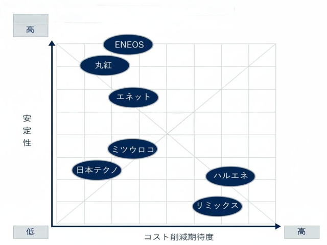 ※ 安定性(縦)×コスト削減期待度(横)の2軸で7社を配置した比較マップです。